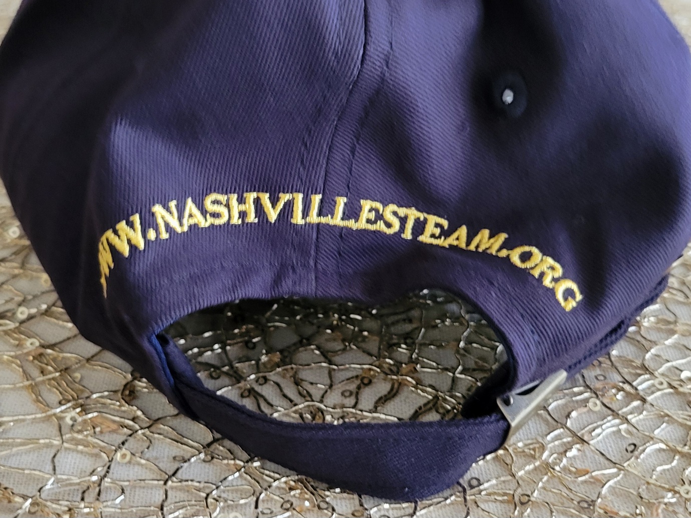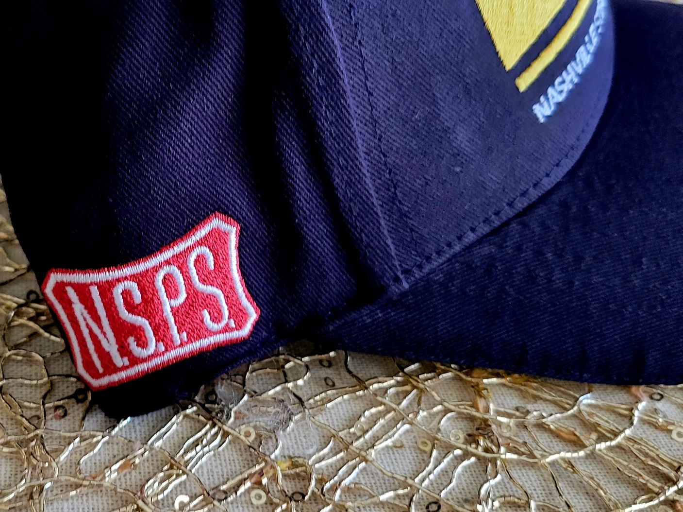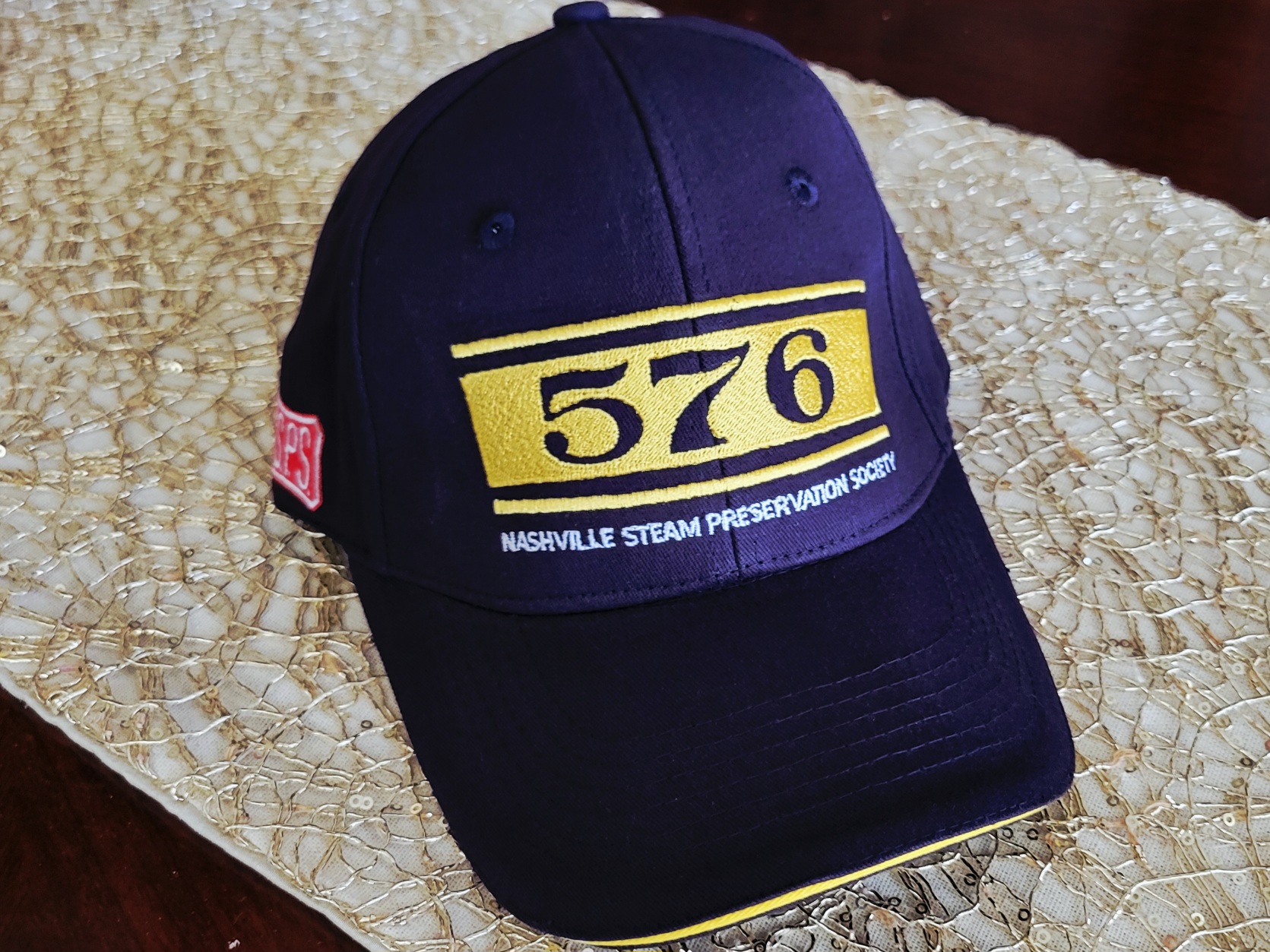576 high thread count stitching on front, deluxe metal adjustment clip; excess strap neatly tucks away inside the hat. NSPS bowtie logo over right ear, NSPS website stitched above arch in back, gold beading on bill.