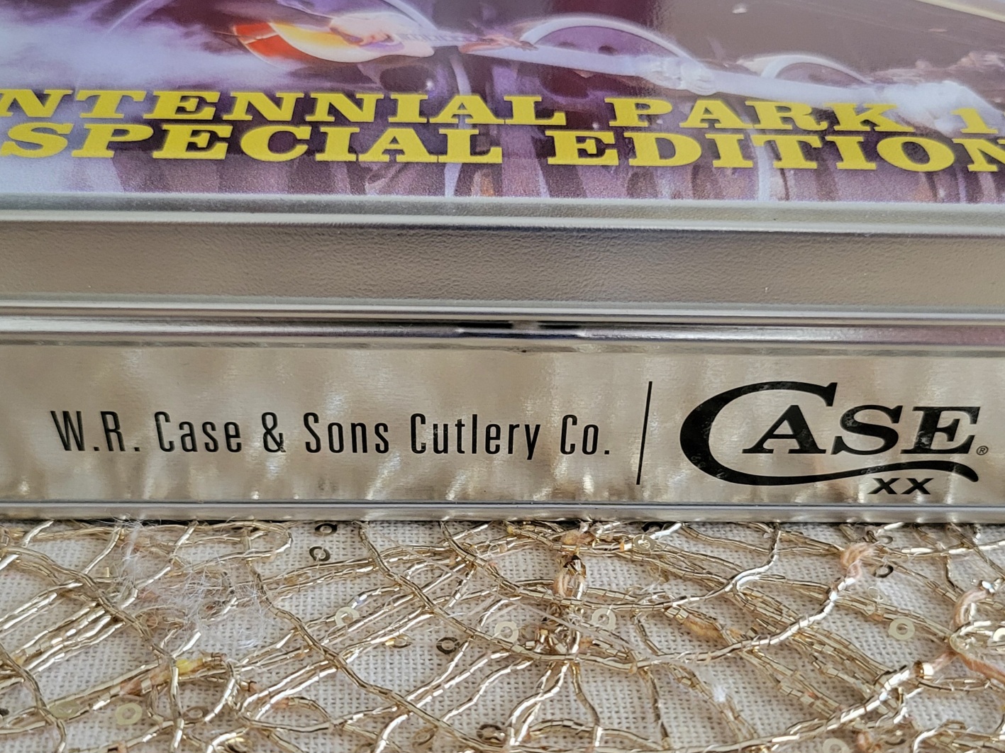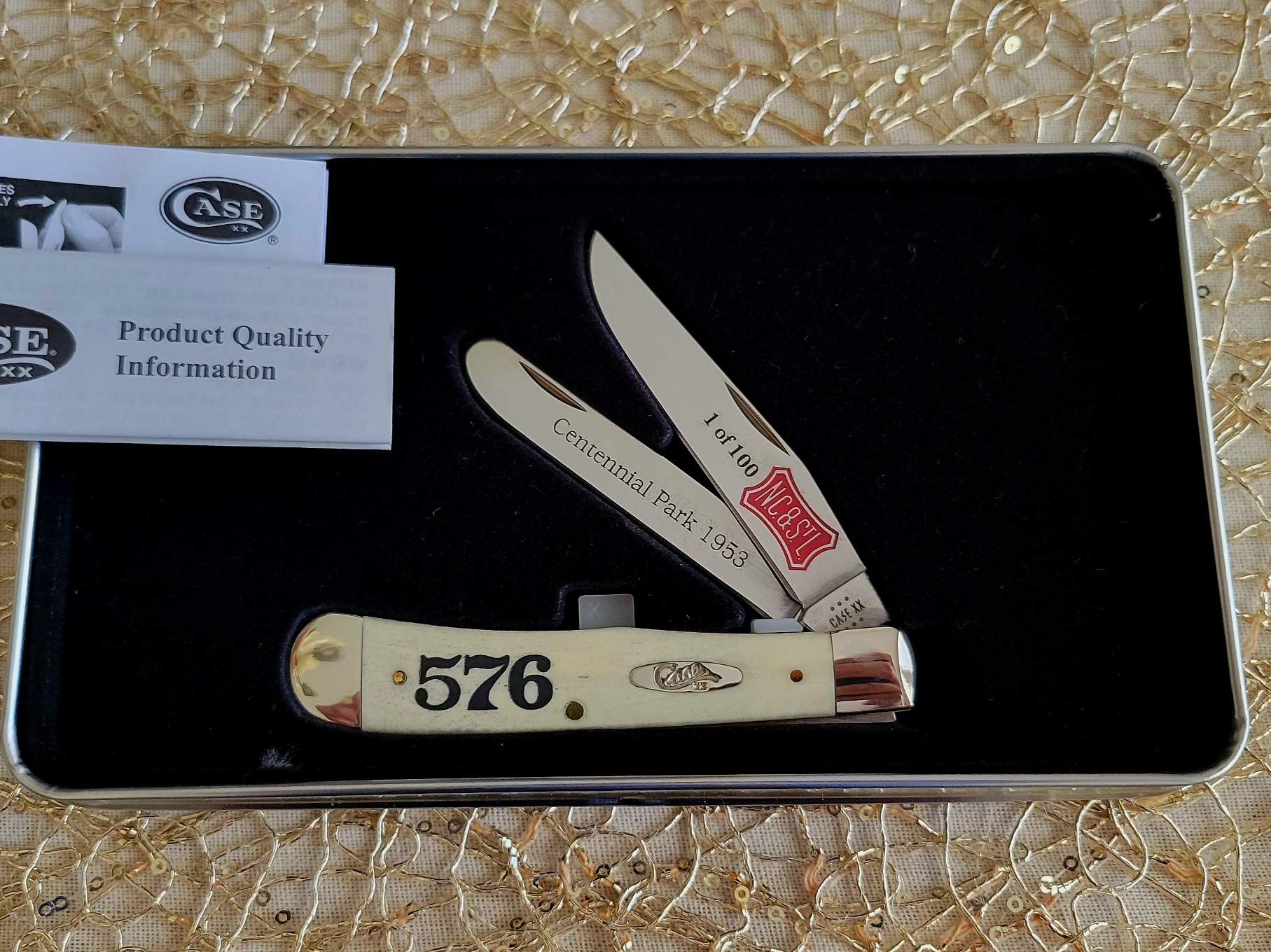 This CASE Natural Bone Smooth Trapper (01446) with stainless steel blades (8254 SS) is laser engraved with the 576 in black on the handle, and has 1 of 100 with the NC&StL Bowtie logo on the main blade, with Centennial Park 1953 on the Spey blade!